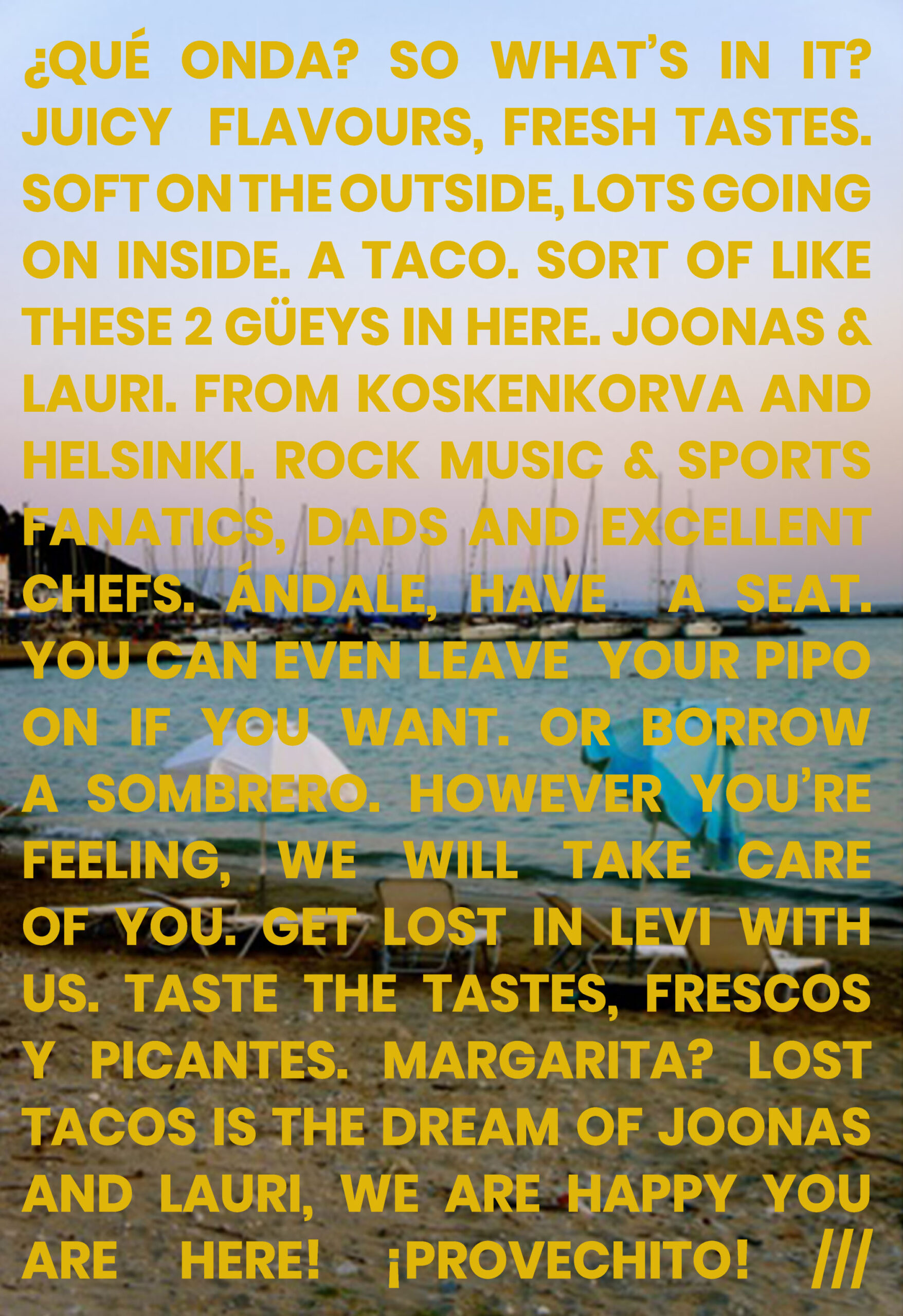 Qué onda? Juicy flavors, fresh tastes. Soft on the outside, lots going on inside. A taco. Sort of like these 2 güeys in here. Joonas&Lauri. From Koskenkorva and Helsinki. Rock music & sports fanatics, dads and excellent chefs. Ándale! have a seat. You can even leave your pipo on if you want. Or borrow a sombrero. However you’re feeling, we will take care of you. Get lost in Levi with us. Taste the tastes, frescos y picantes, have a margarita. Lost tacos is the dream of Joonas and Lauri, we are happy you are here! !Provechito!