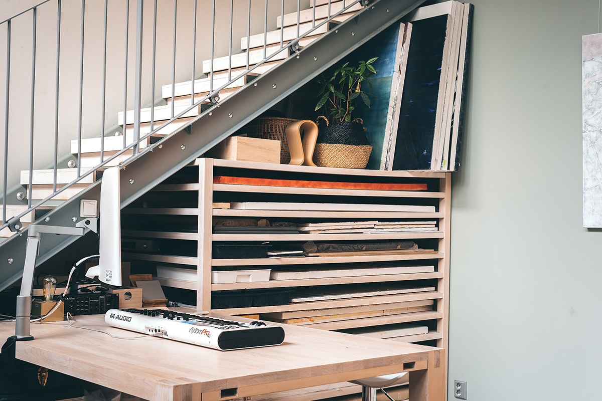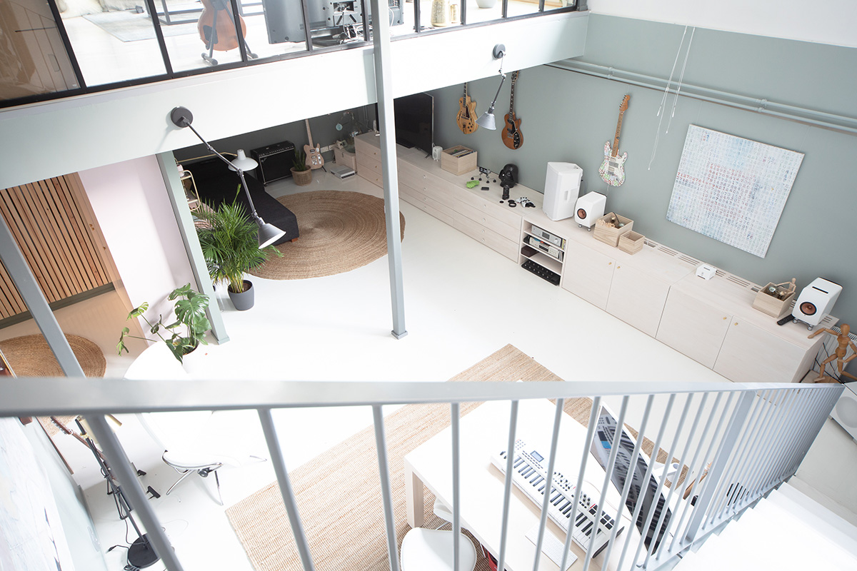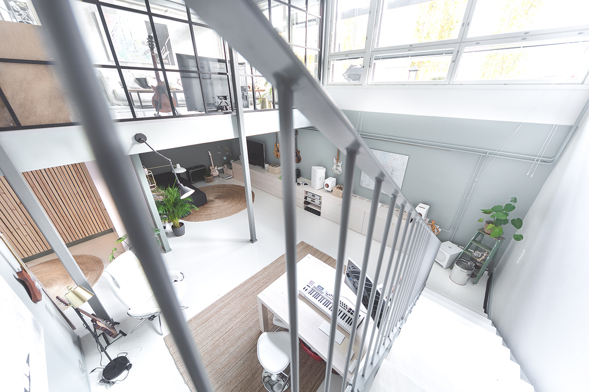 Alun perin tämä tila noudatti kodin teollista tyyliä harmaan sävyillä, mutta sai nyt pehmeitä sävyjä ja huippulaadukasta käsityötä. Kaikki puukalusteet tehtiin mittatilaustyönä kitaroiden ja kankaiden säilyttämiseen. Samalla tätä ihanaa kotia kehystivät myös lasiseinät mustilla listoilla kaikissa kolmessa kerroksessa.