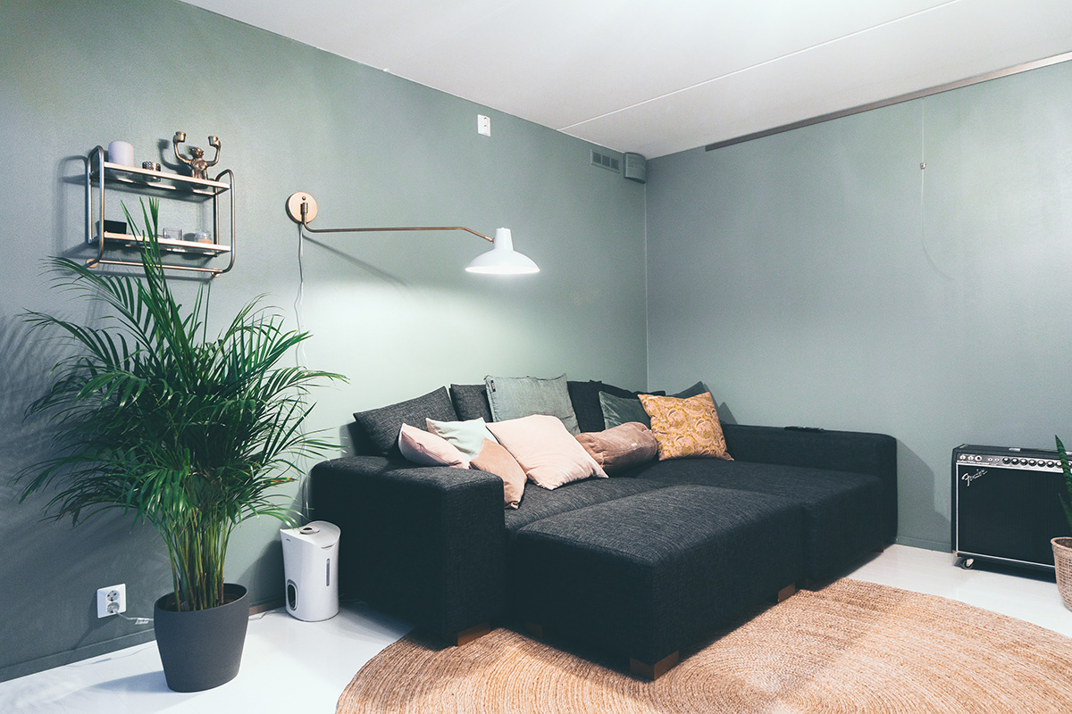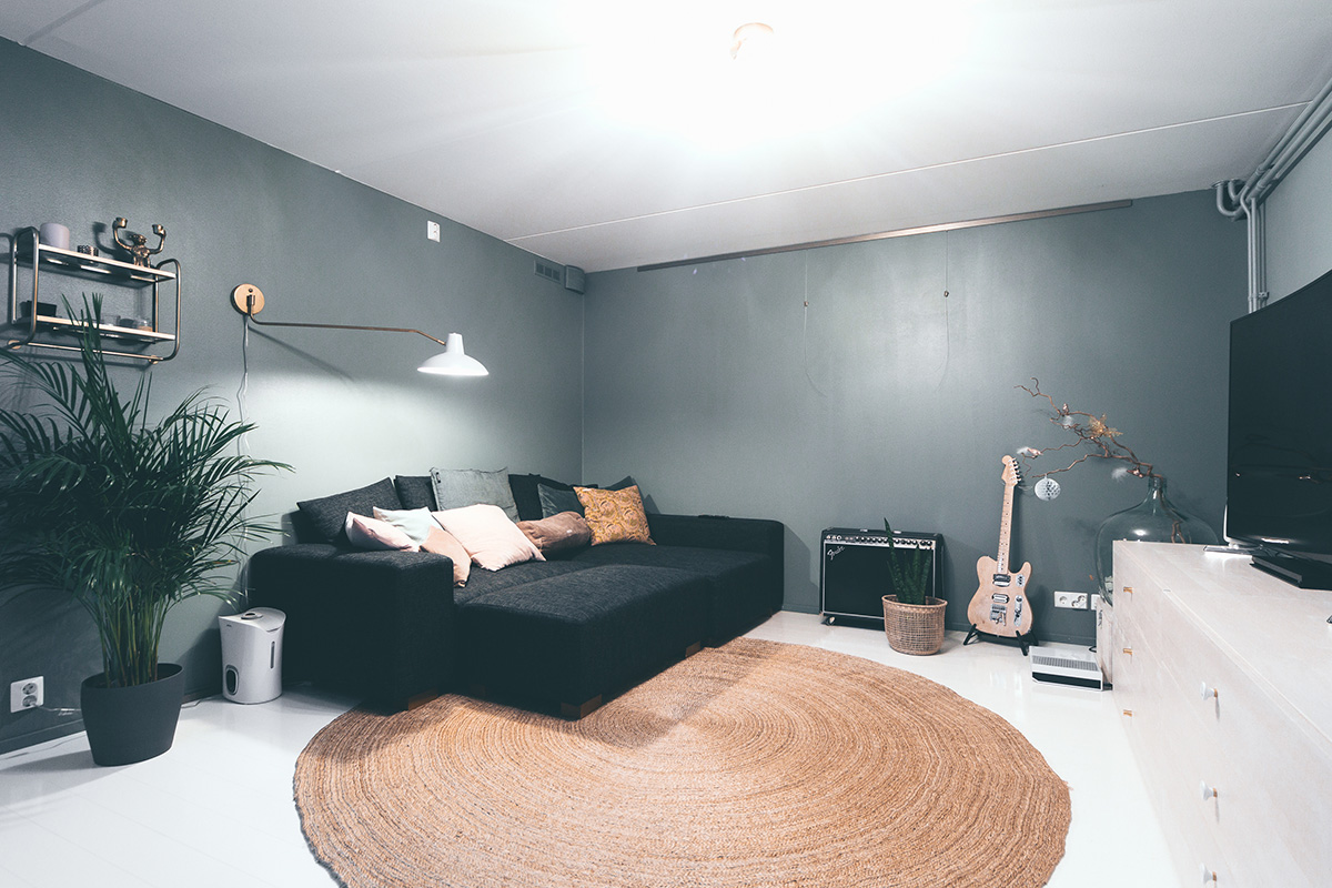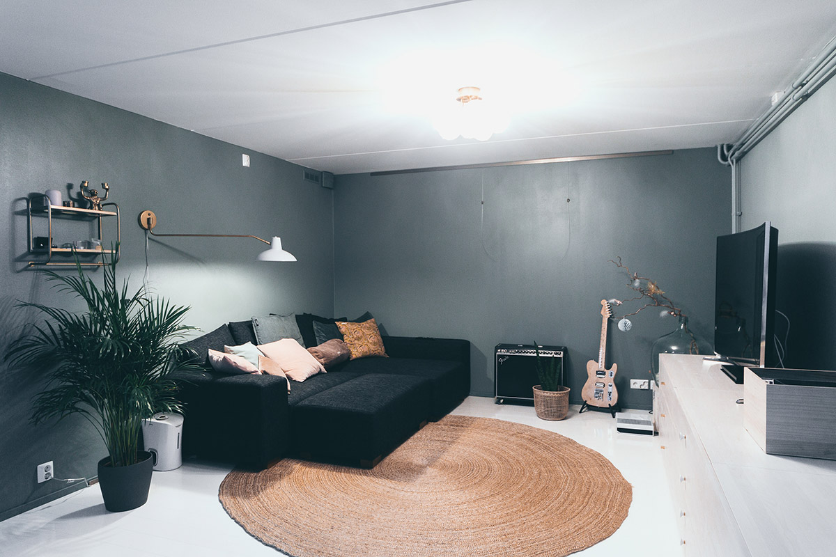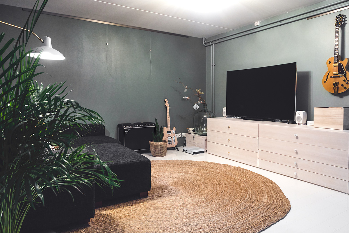 Toinen vuosi tässä yksityiskodissa vierailulla oli tietty teema: miten muuttaa tämän kodin ensimmäinen kerros ”miesluolaksi” useilla toiminnoilla. Sen piti olla tila musiikille, maalaukselle ja TV-loungelle koko perheelle. Ratkaisuna oli luoda erillinen pesä matalan katon alle viihtyisää perheaikaa varten. Korkeampi tila jätettiin luovaa työtä varten sisään tulevan upean luonnonvalon ansiosta.