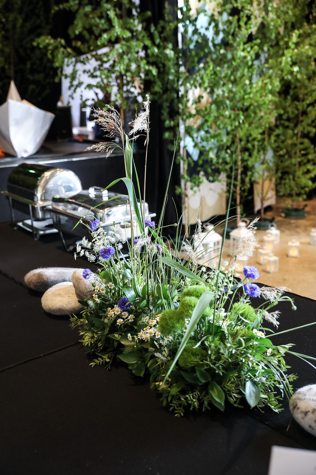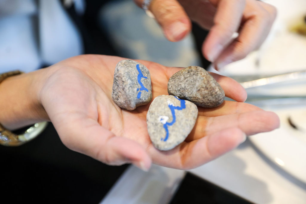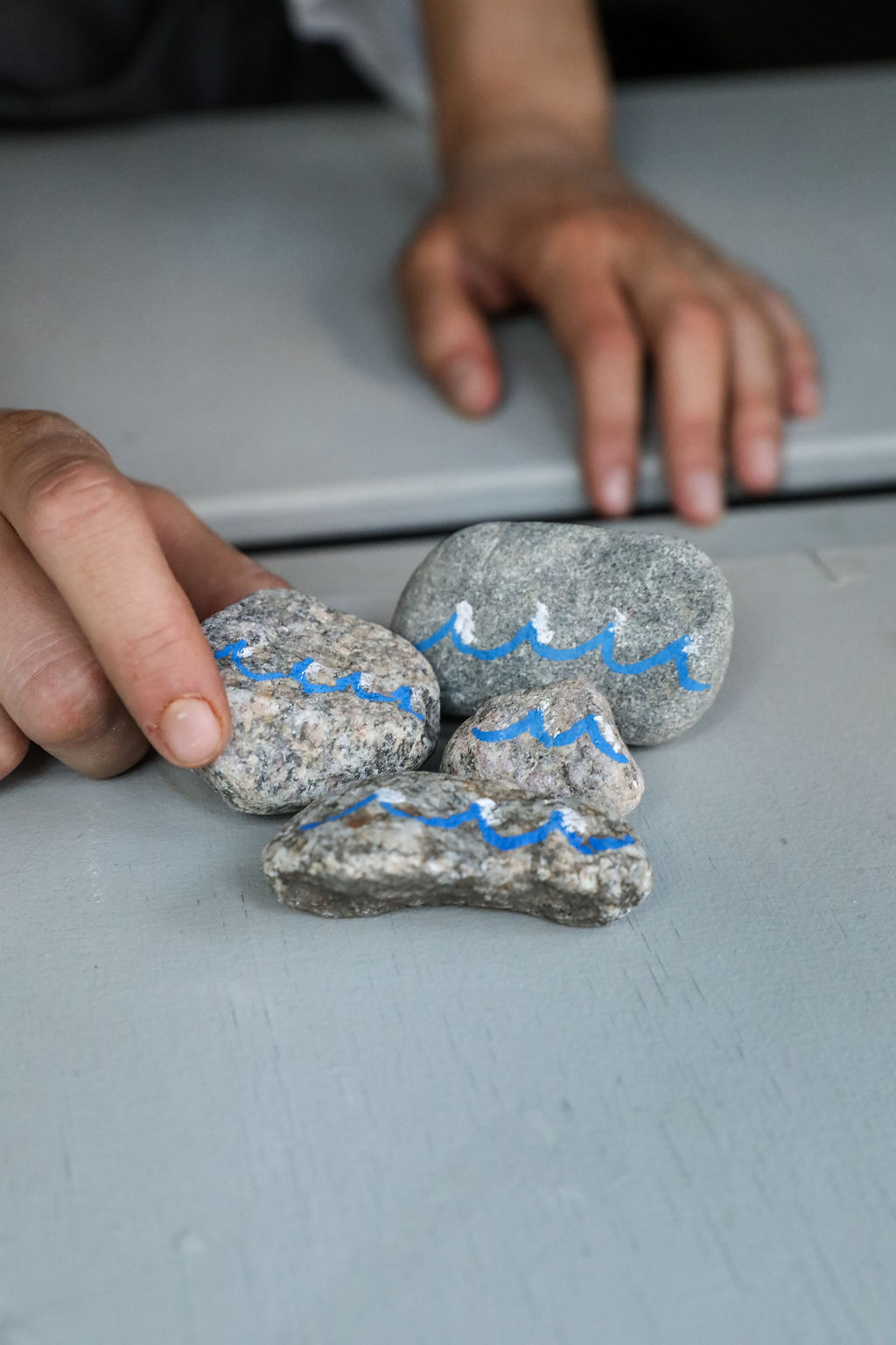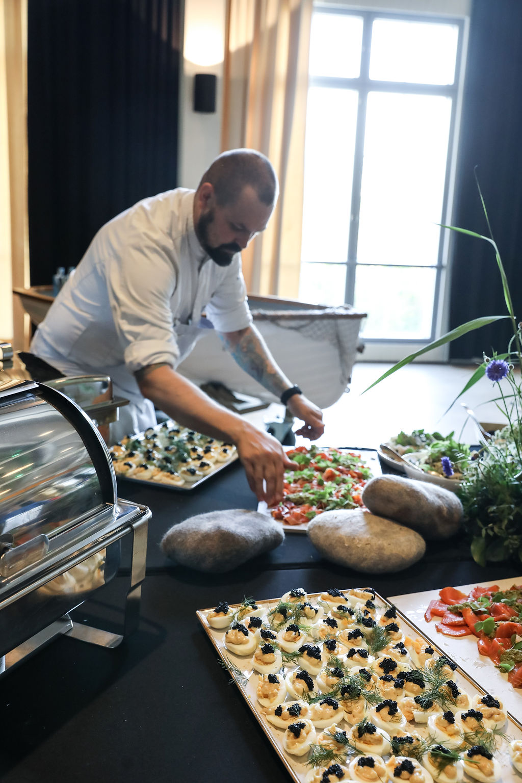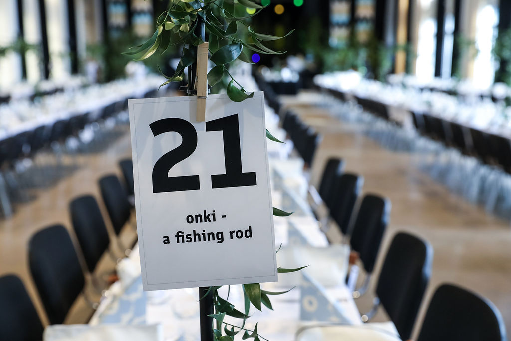 Kuten aina, haluamme miettiä vieraamme polun alusta loppuun. Siksipä kipaisimme kuljettajille teemaan sopivat hatut jo edellisenä päivänä. Vieraiden saapuessa näiden merikapteenien kuljettamina Ruissaloon, heidät vastaanotti Lassen ja kesämiesten saaristohenkinen orkesteri – kuin kaikkien aistien postikortista! Pöydät koristeltiin saariston luonnosta löytyvillä elementeillä ja paperiveneillä. Pöydistä löytyi myös kaikin puolin arvokas pussi jokaiselle: turkulaisten meripartiolaisten, Auran Tyttöjen, vanhoista purjekankaista tekemät pussukat, jotka sisälsivät illan baarivaluutan: pienet maalatut kivet.