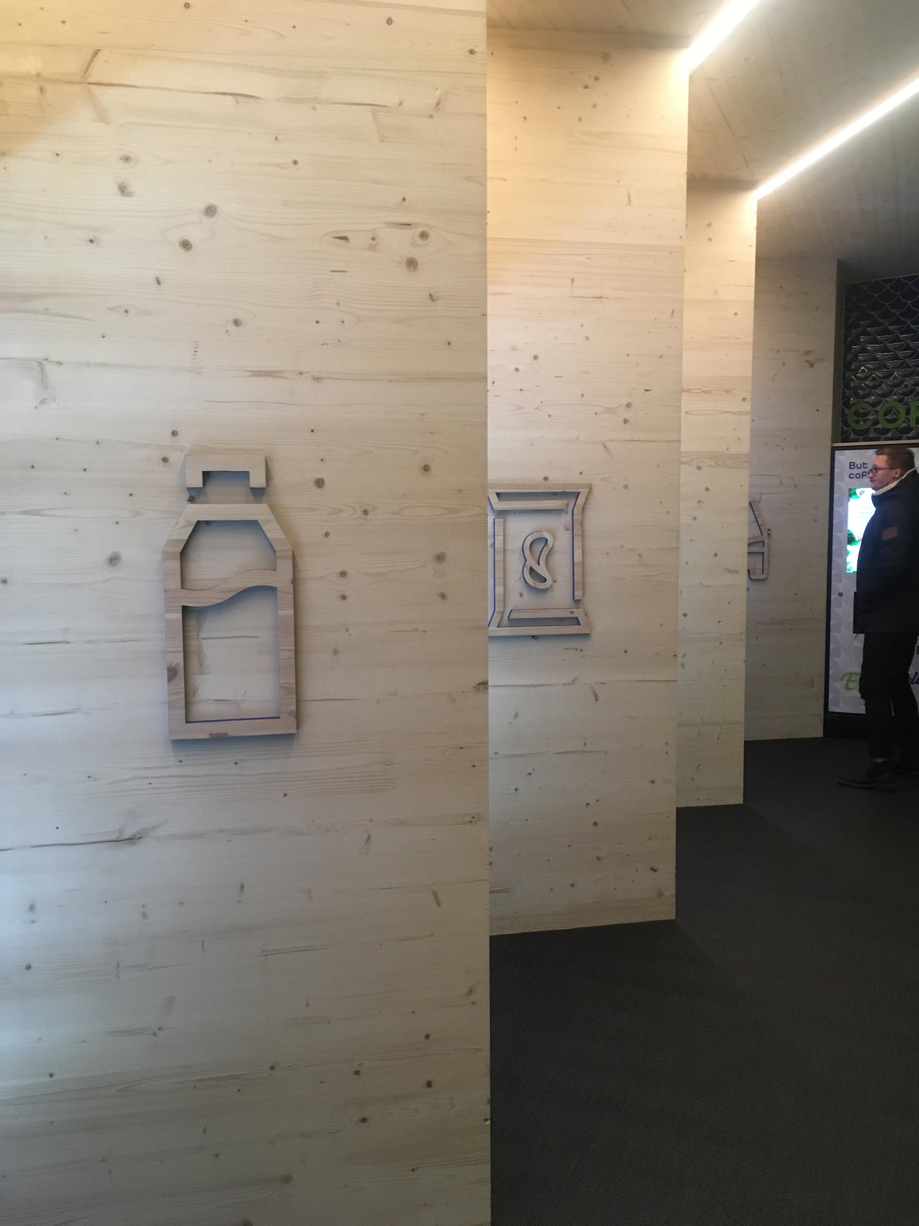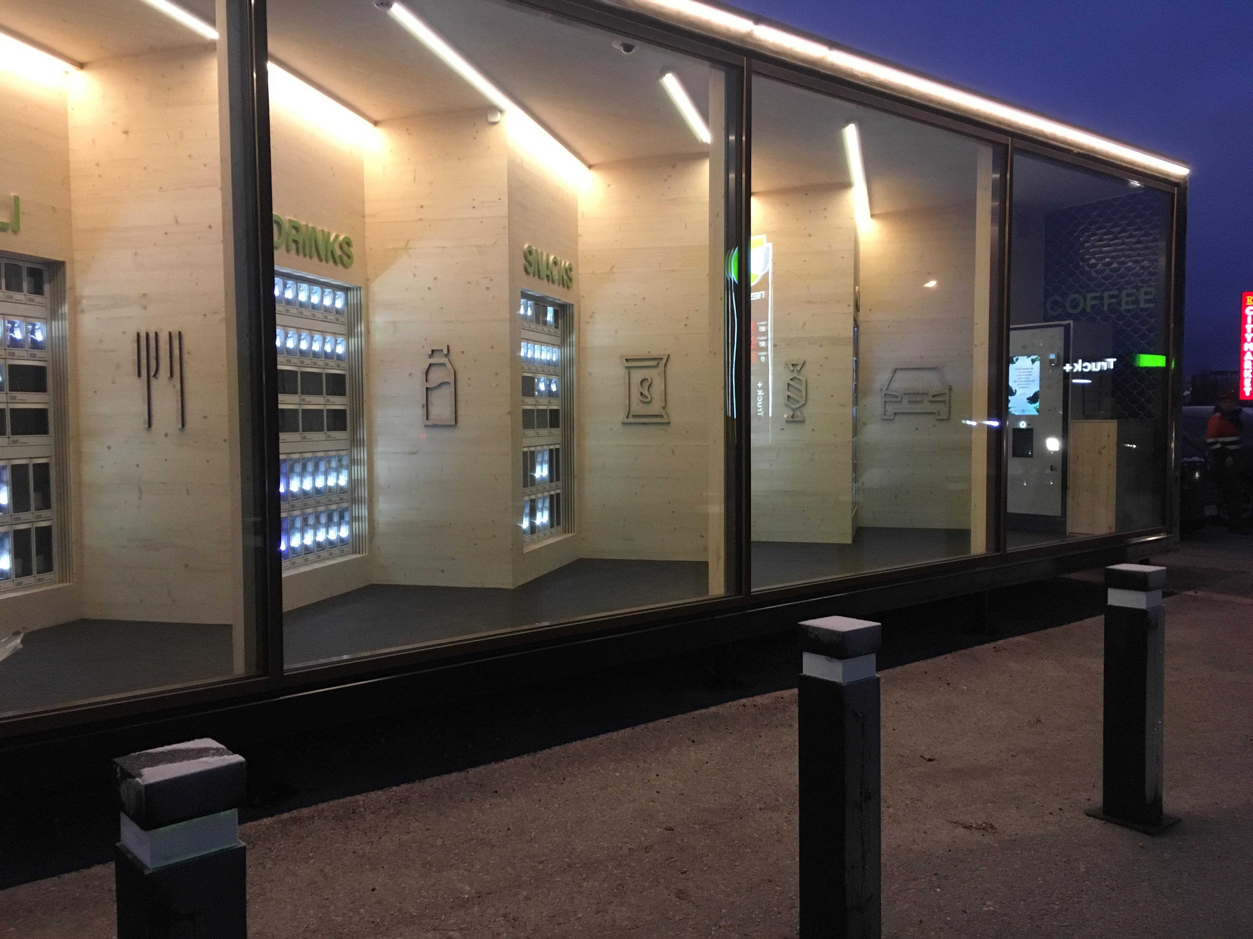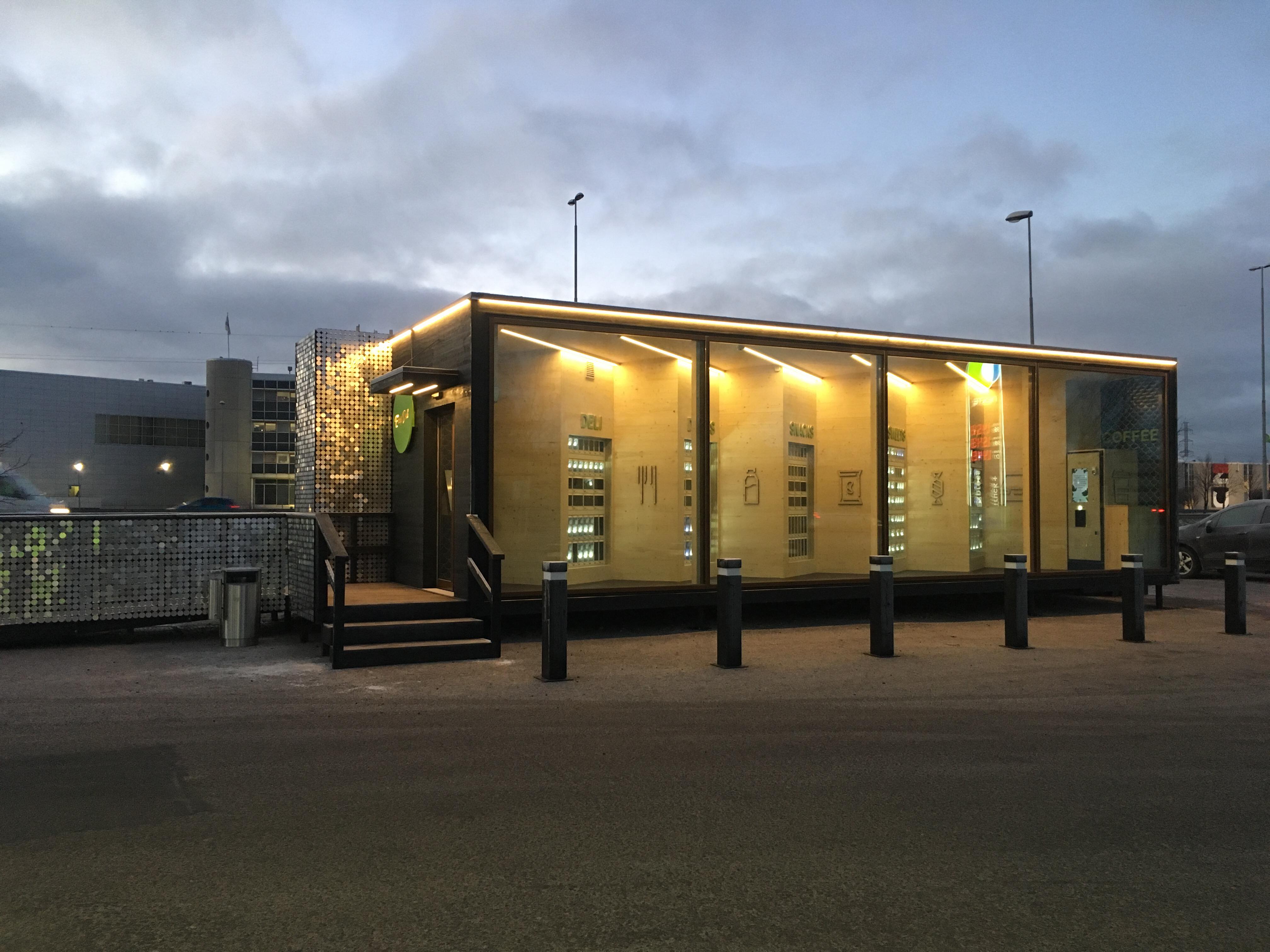 Ajatuksena oli tuoda kodikas, viihtyisä tunne miehittämättömään kauppaan. Suuret ikkunat näyttävät luonnonpuun sisältä ja tekevät kaupasta kutsuvan, sekä helpottavat valikoiman näkemistä jo sisään tultaessa. Turvallinen ilmapiiri on tärkeä myös kaupan sisällä, tällä tavoin on helppo nähdä kuka on tulossa ja miten ulos jätetty koira pärjää 🙂