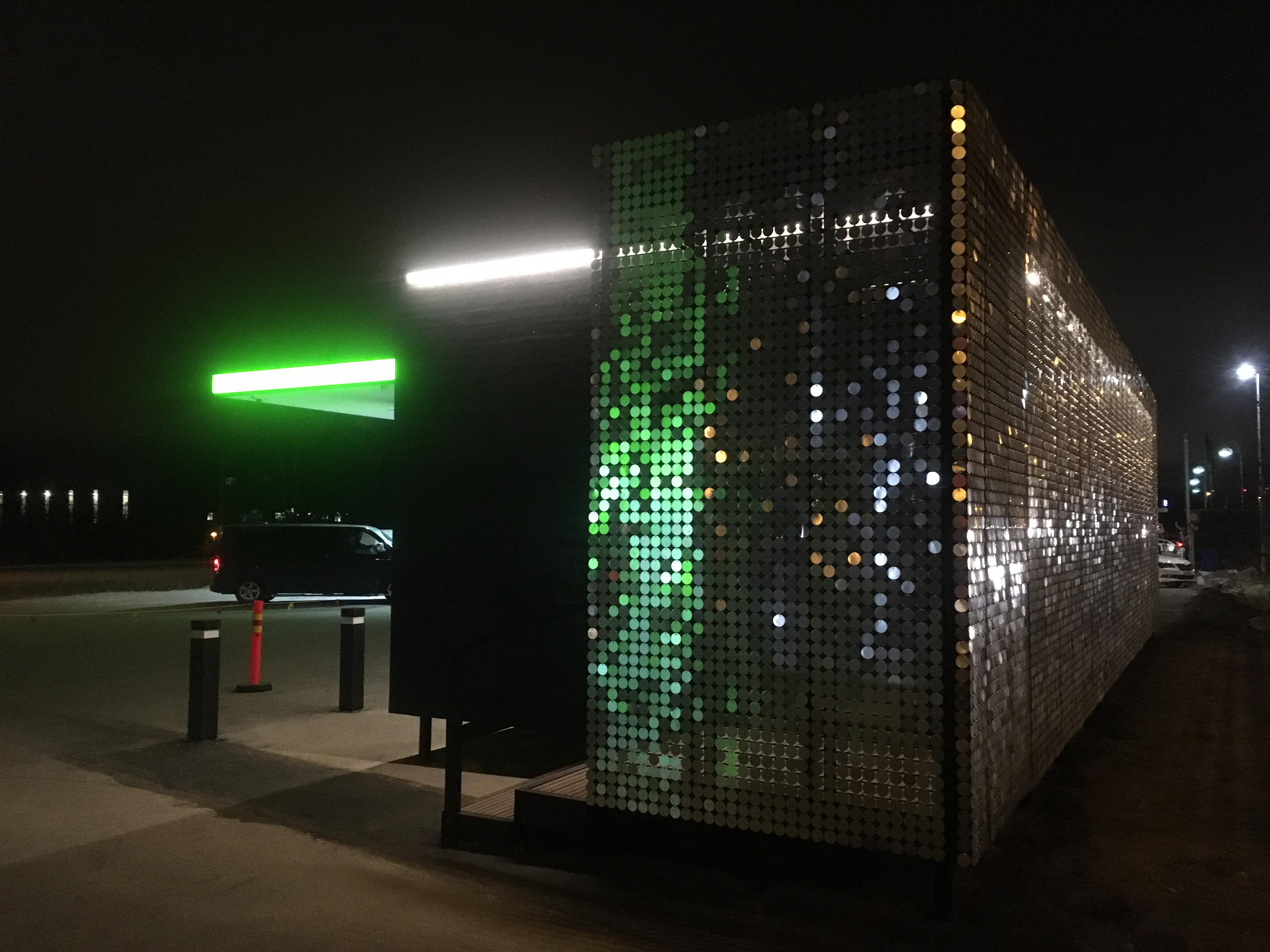 Neste Easy Deli kimaltelee ohiajavien autojen valojen loisteessa tai kun auringonsäteet osuvat rakennuksen sivuihin.