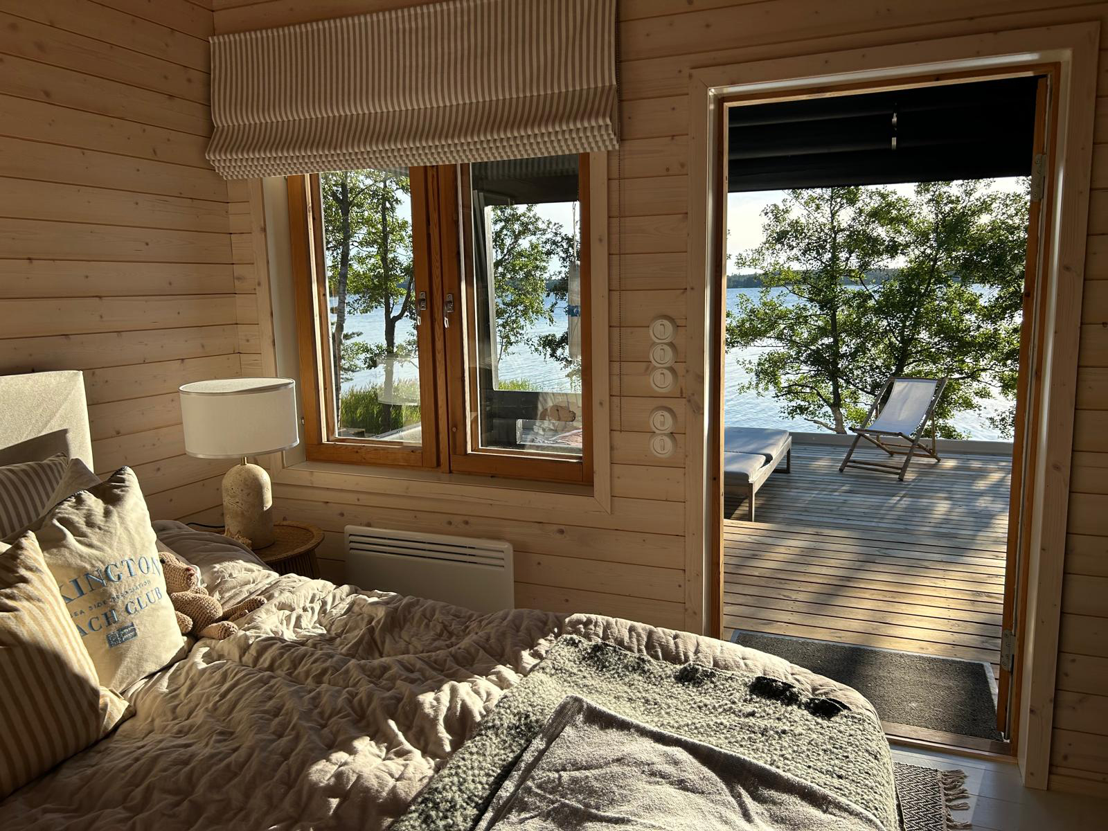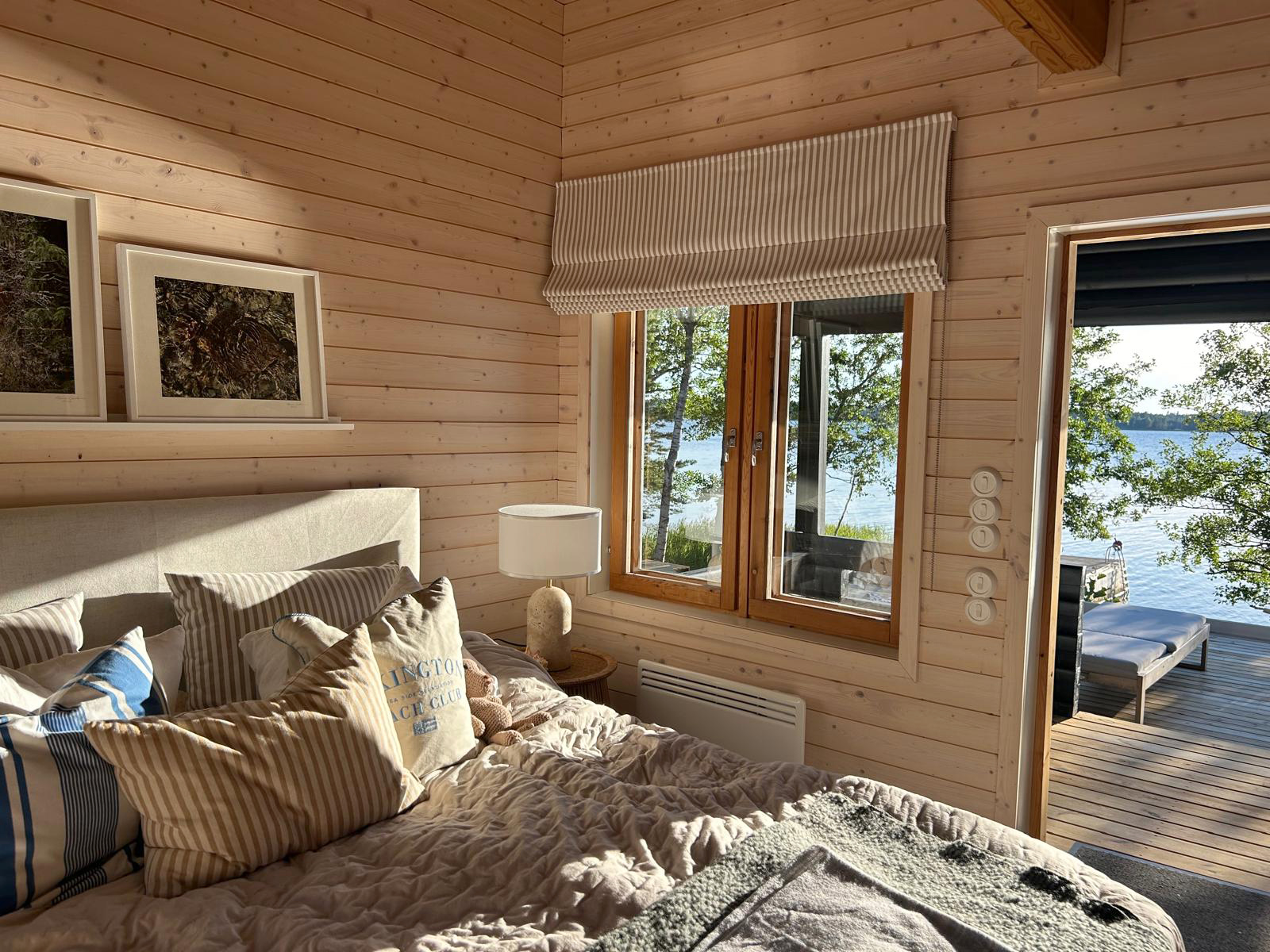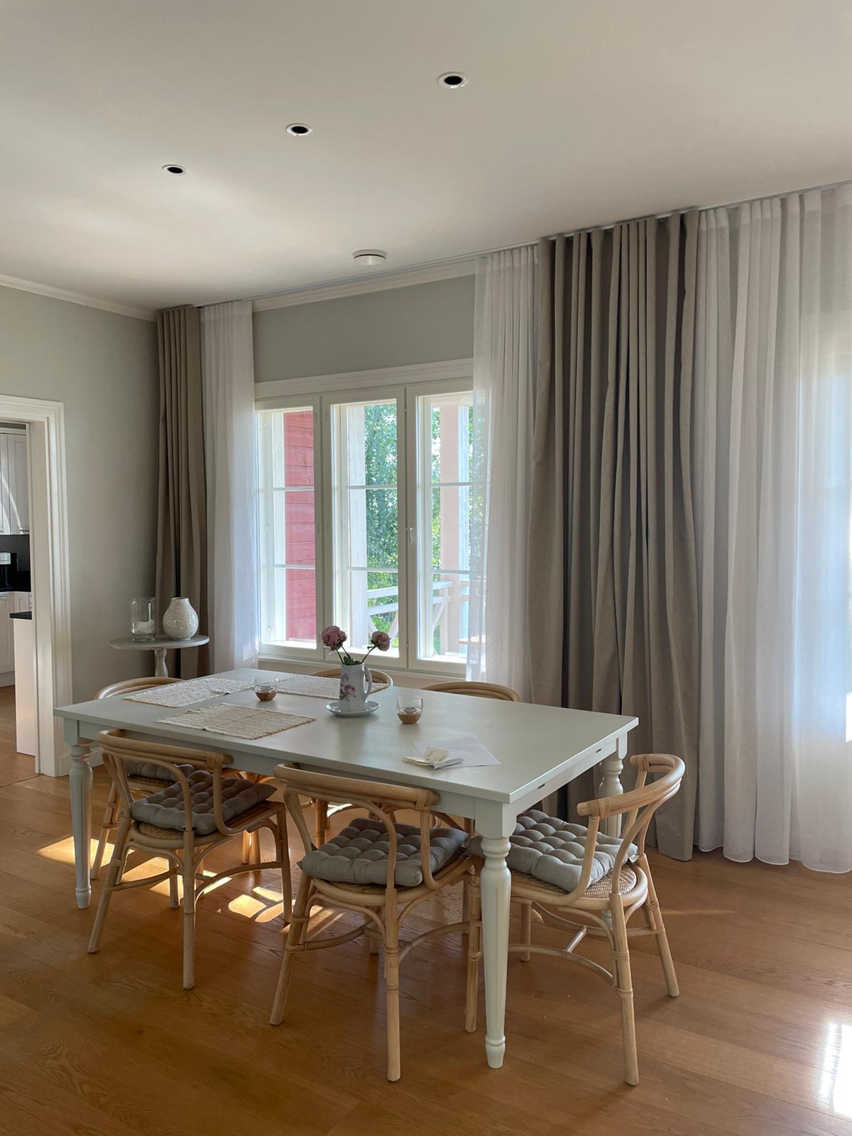 Kun työmatkaan sisältyy lossi, tietää jo siitä että perillä odottaa jotain erityistä. vuosien 2021-2023 aikana ajelin ahkerasti erilaisissa keleissä kohti tätä rantaparatiisia, jossa tunsi verenpaineen laskevan heti pihaan kääntyessä. Asiakkaan toiveissa oli päivittää ryhdikästä huvilaa kohti Hamptonsia, pienellä twistillä. Talo on itsessään upea, hienosti ja huolellisesti rakennettu ja suunniteltu. Sitä päivitettiin tuulessa heiluvilla verhoilla, kutsuvilla vuodetekstiileillä ja kepeillä kalusteilla. Tekstiileiden toteutuksesta vastasi jälleen taitava Susanna Ridosta. Osa kalusteista löydettiin lähiseudun kirppiksiltä, ja näin saatiin tunnelma säilymään kotoisana. Asiakkaan itse löytämä taulu huipensi kepeän kesäfiiliksen.