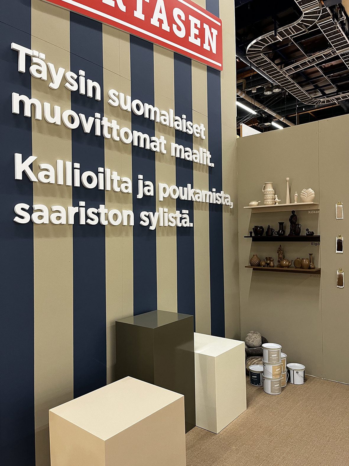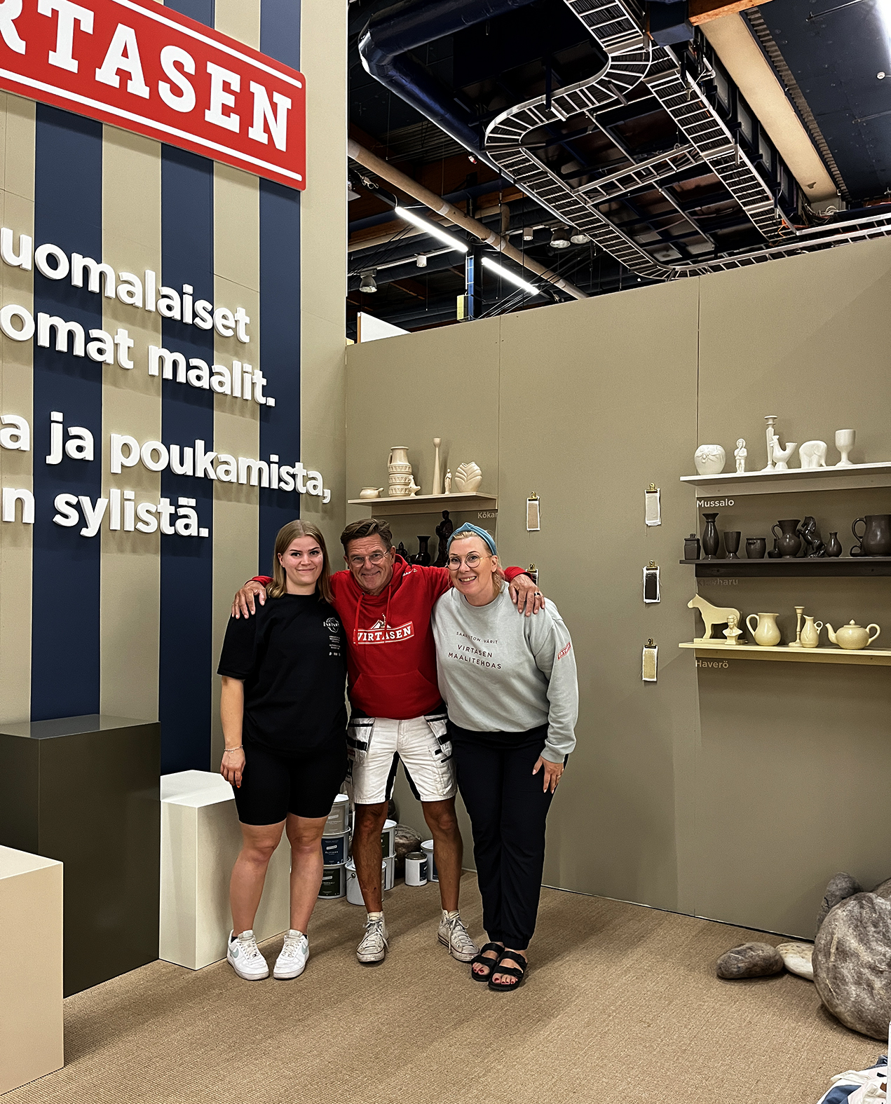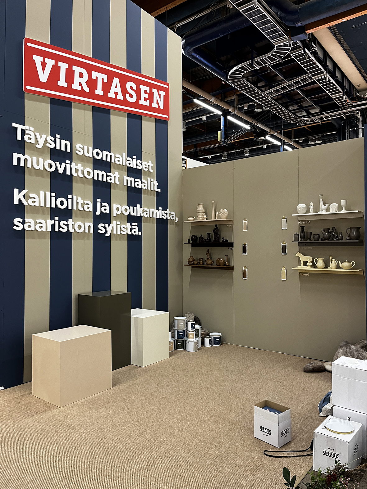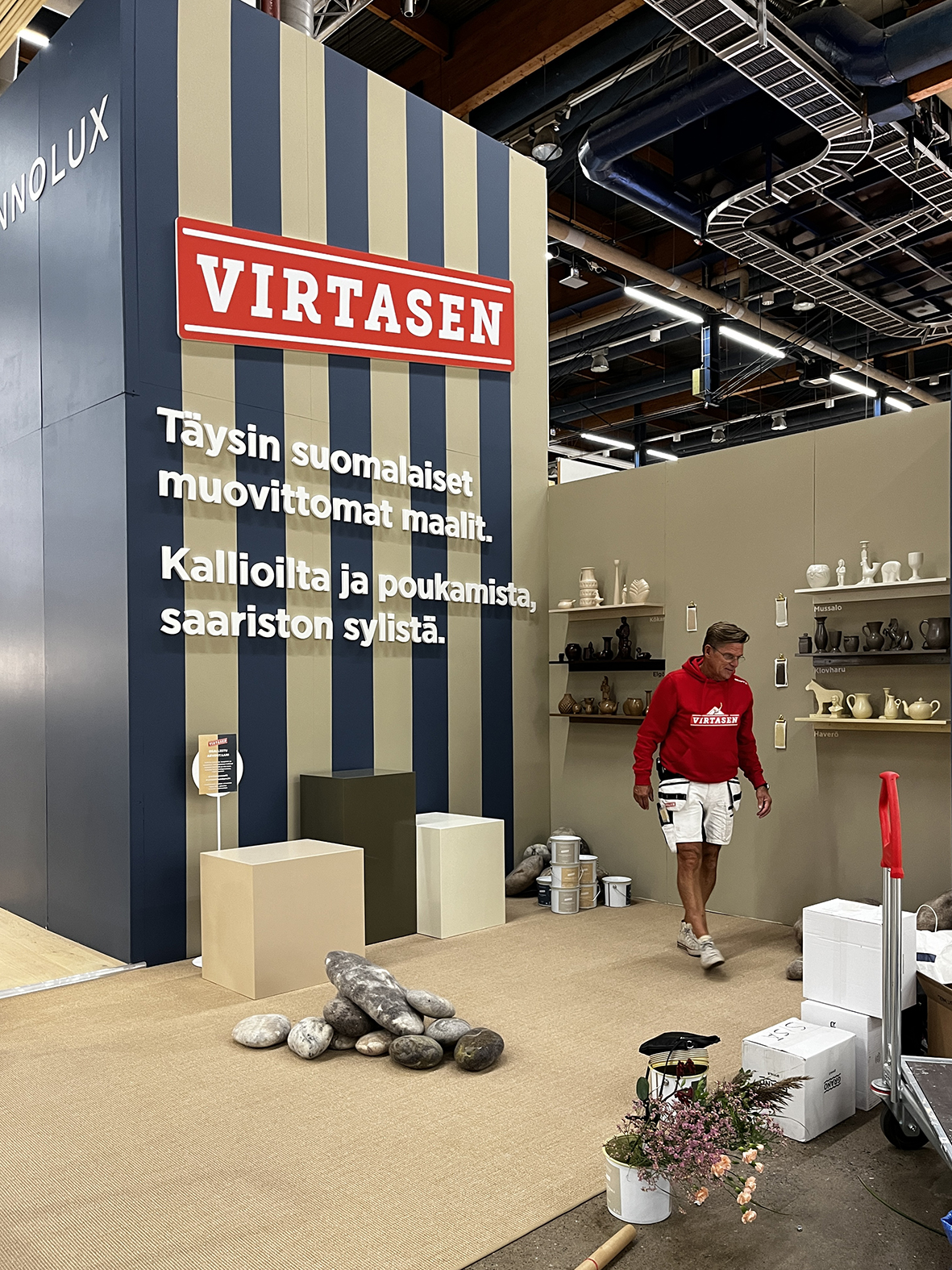 ”Sisse kuunteli hyvin tarkkaan toiveemme osastosta ja sai heti kiinni punaisesta langasta, työskentely Sissen kanssa on mutkatonta ja helppoa. Osasto oli erittäin onnistunut ja toimiva, palautetta saimme läpi messujen sekä vielä niiden jälkeen. Palaute on ollut pelkästään positiivista. Sisse tekijänaisena kääri myös omat hihansa ja tarttui maalipensseliin. Arvostimme myös suuresti Sissen panostusta messuosaston rakentamiseen paikan päällä. Kaunis messuosasto tuottaa meille edelleen iloa koska saimme hyödynnettyä Sissen suunnittelemia hyllyjä, kuutioita ja mattoa omassa showroomissamme. Jopa käkkärämännyt päätyivät kaunistamaan tehtaan pihaa” Anni Vinkki, Sales Manager, Virtasen Maalitehdas