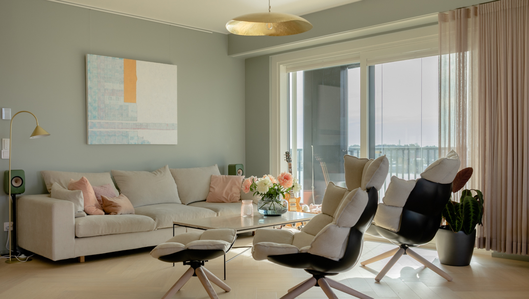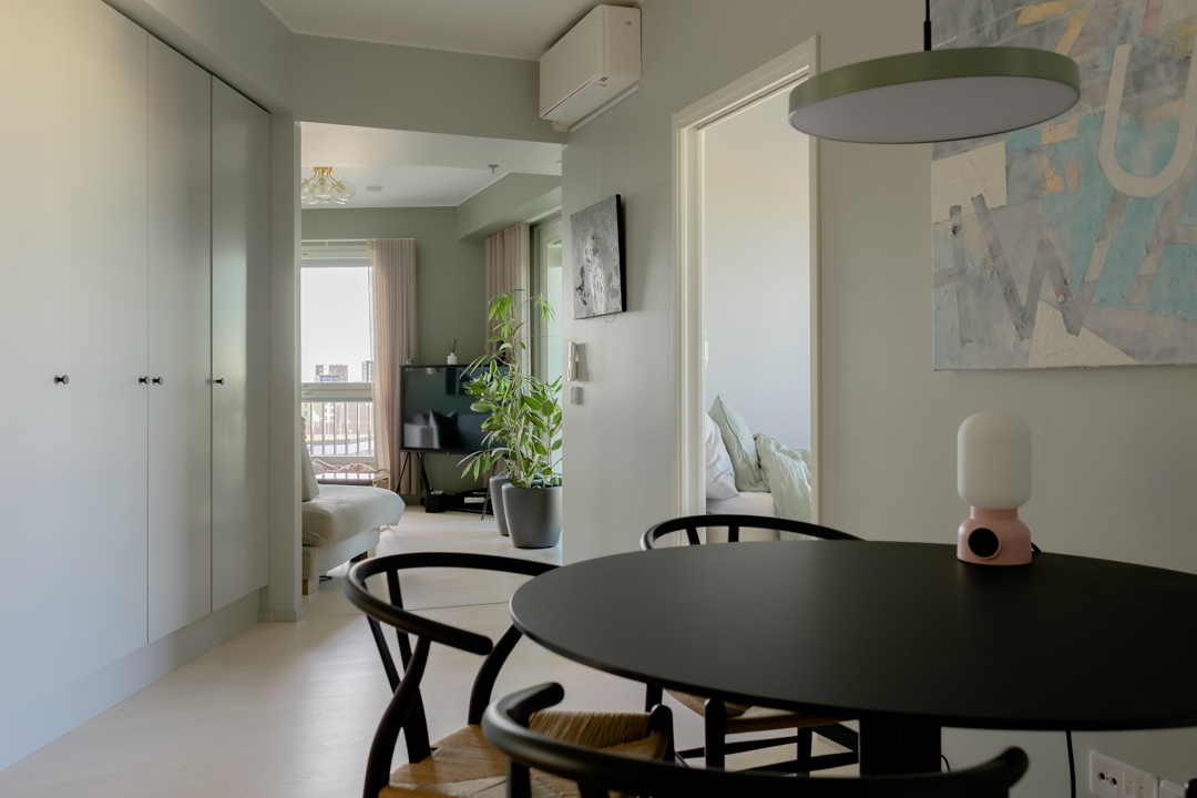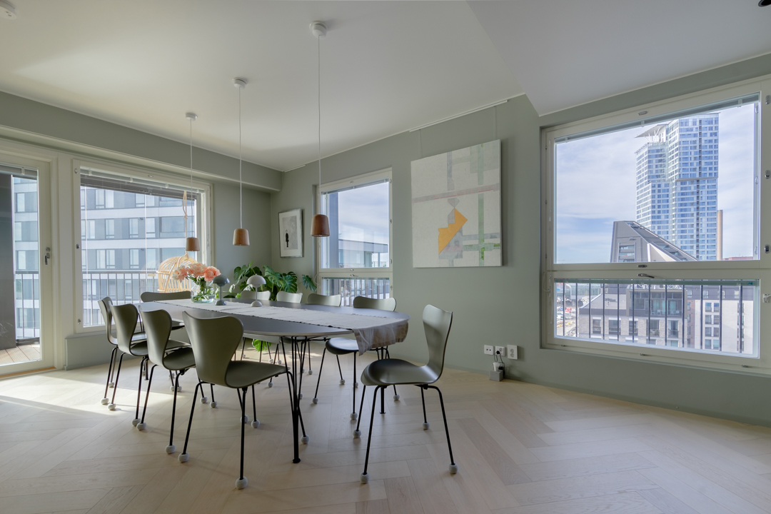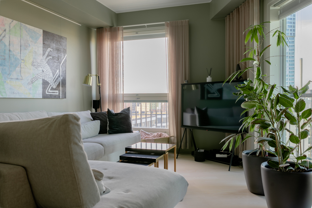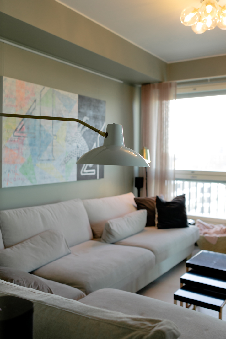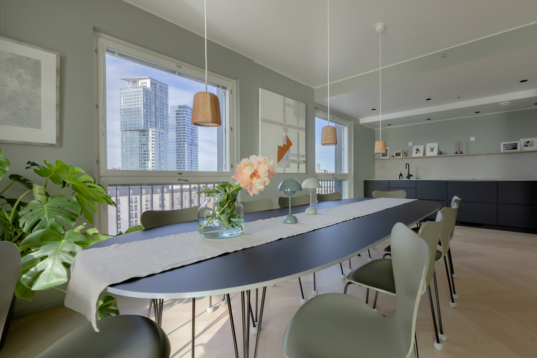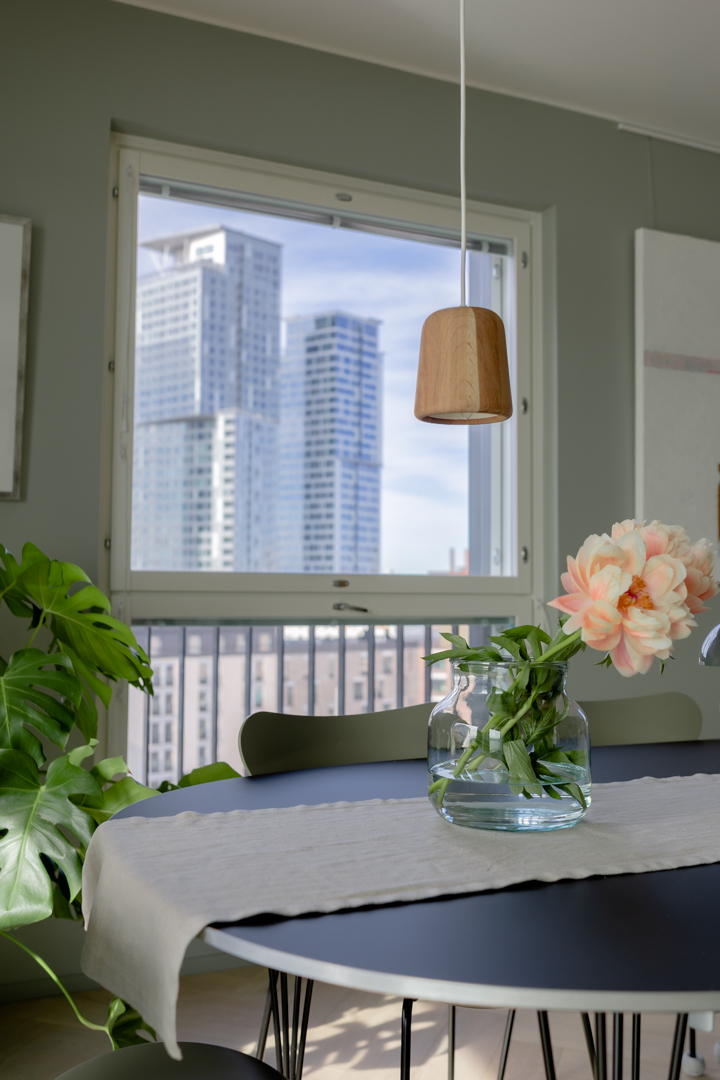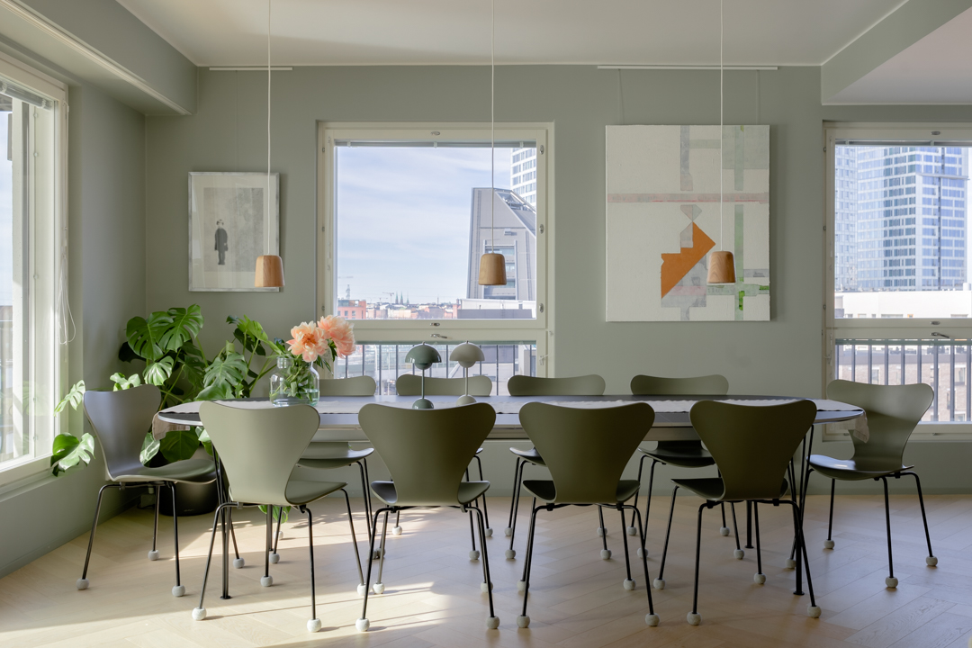 Maisemat vaihtuvat päätä kääntämällä tässä kodissa. Saaristotunnelmasta kaupunkisiluettiin, vain ikkunasta toiseen. Tämän asiakkaani kanssa ollaan matkattu parikin kotia, useampia eri huoneita ja kerroksia, ja välillä vähän mökkiäkin, vuosien varrella. Nyt uuden kodin toiveissa oli rauhallisuus, tunnelma ja lapsille oma maailma. Prosessi oli pitkä, rakennuksen edistymistä päästiin seuraamaan ensin virtuaalisti ja myöhemmin työmaakäynneillä. Useamman asunnon yhdistäminen toi sopivasti haasteita. Henkilökohtainen taide oli myös isossa roolissa tämän kodin suunnittelussa.