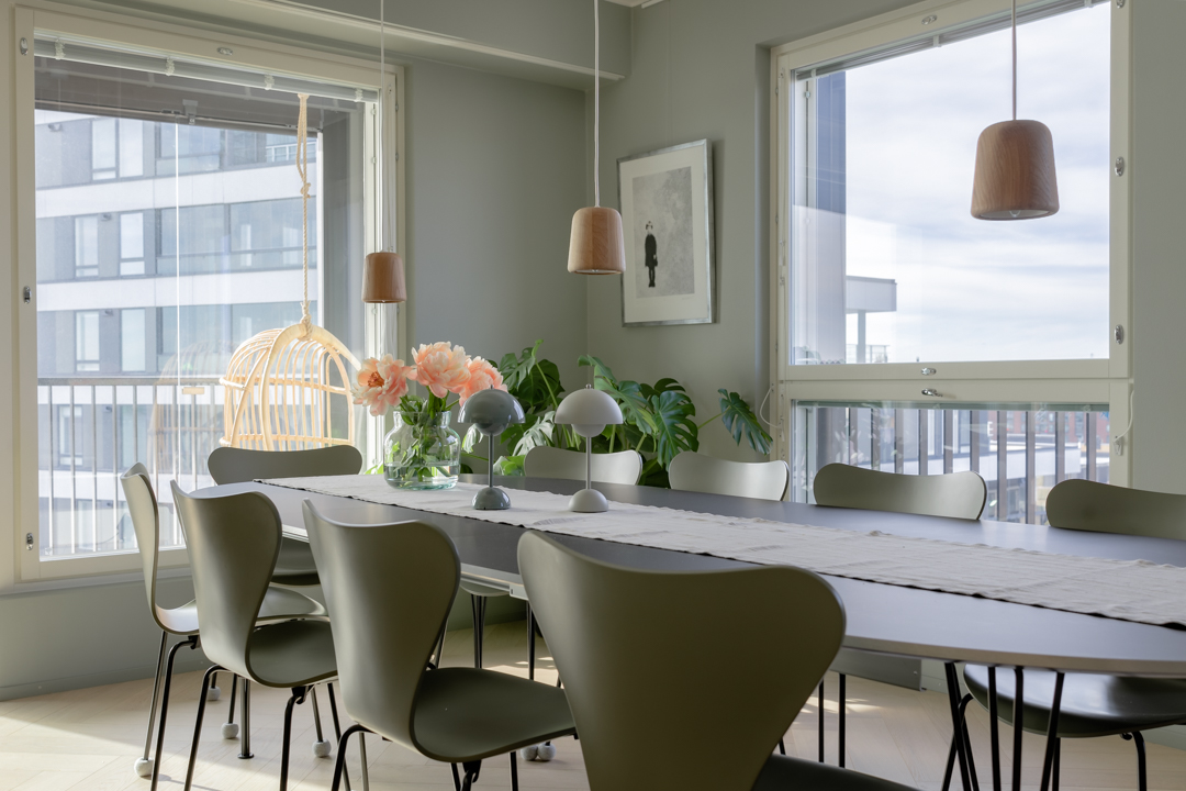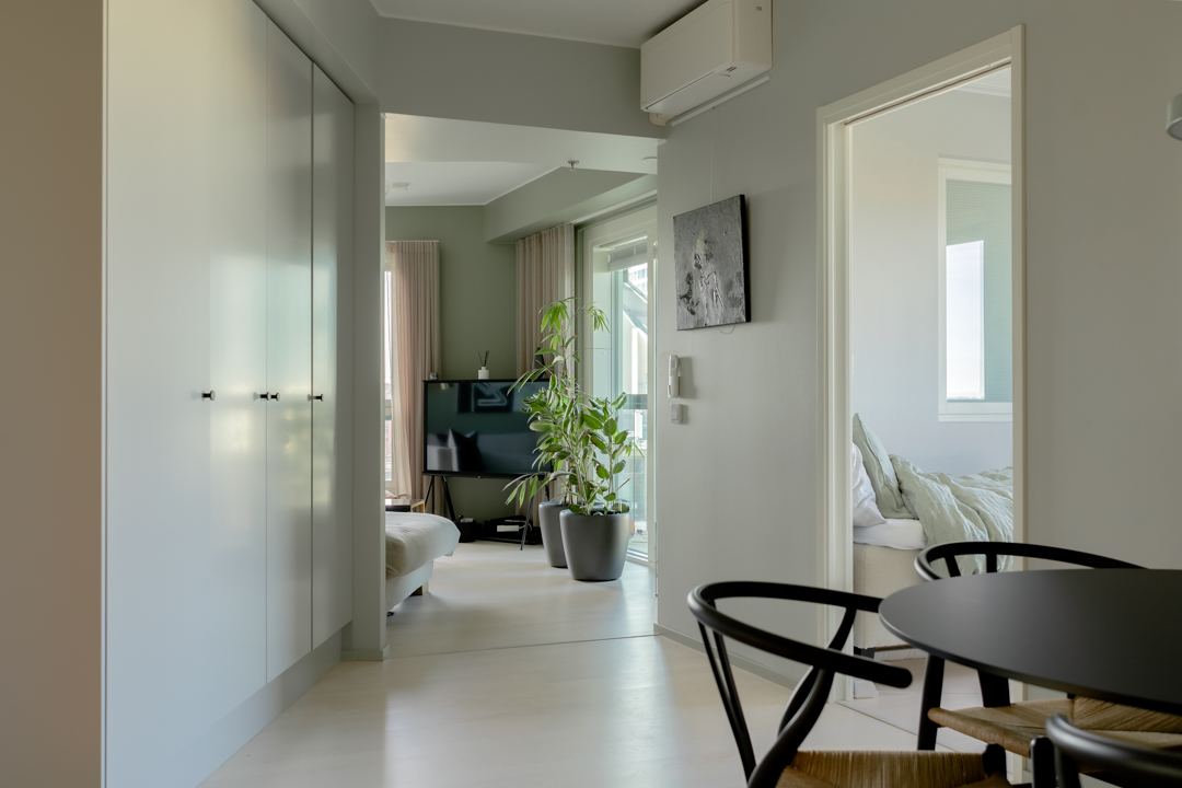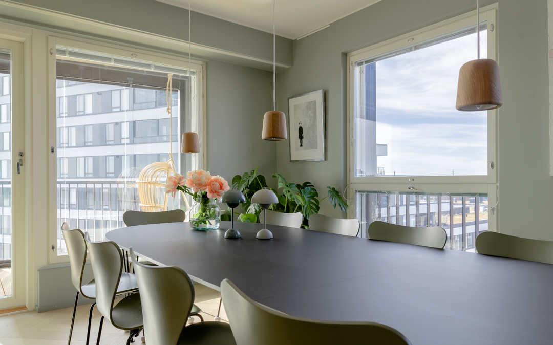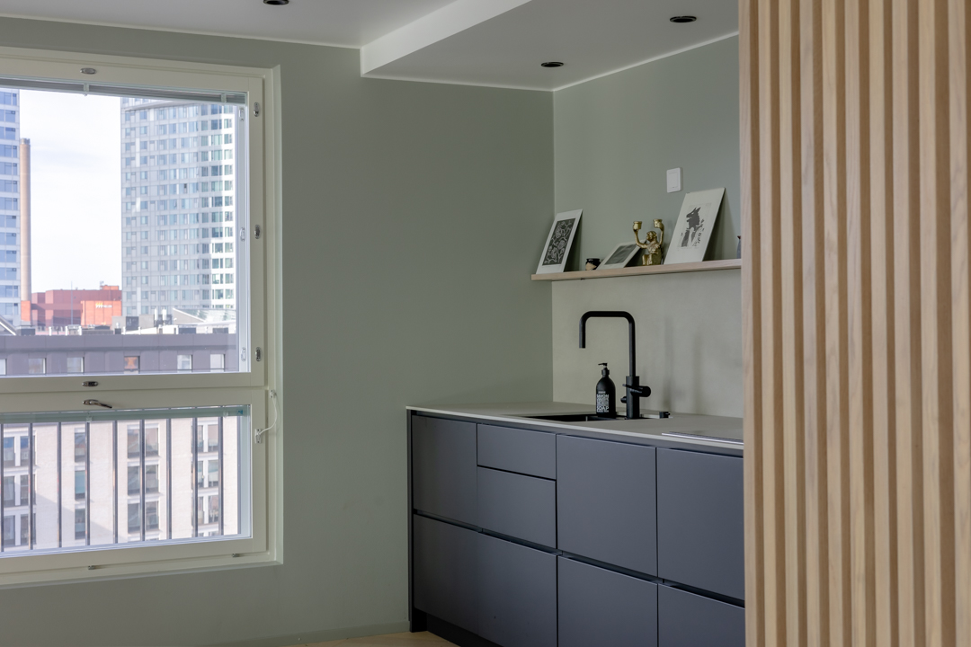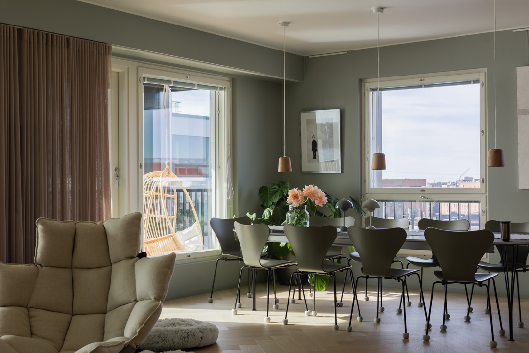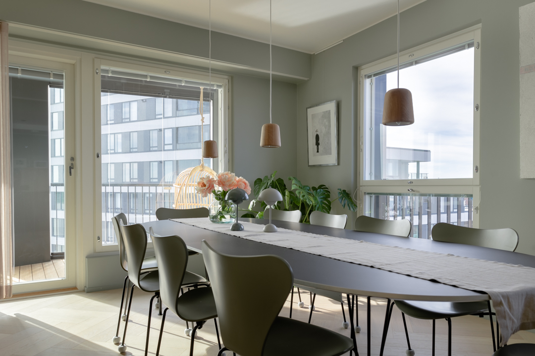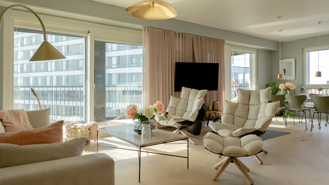 Maisemat vaihtuvat päätä kääntämällä tässä kodissa. Saaristotunnelmasta kaupunkisiluettiin, vain ikkunasta toiseen. Tämän asiakkaani kanssa ollaan matkattu parikin kotia, useampia eri huoneita ja kerroksia, ja välillä vähän mökkiäkin, vuosien varrella. Nyt uuden kodin toiveissa oli rauhallisuus, tunnelma ja lapsille oma maailma. Prosessi oli pitkä, rakennuksen edistymistä päästiin seuraamaan ensin virtuaalisti ja myöhemmin työmaakäynneillä. Useamman asunnon yhdistäminen toi sopivasti haasteita. Henkilökohtainen taide oli myös isossa roolissa tämän kodin suunnittelussa.