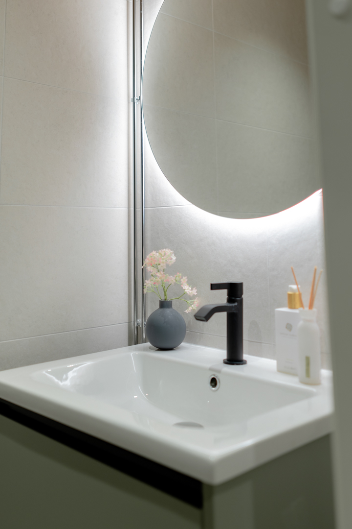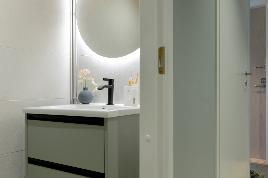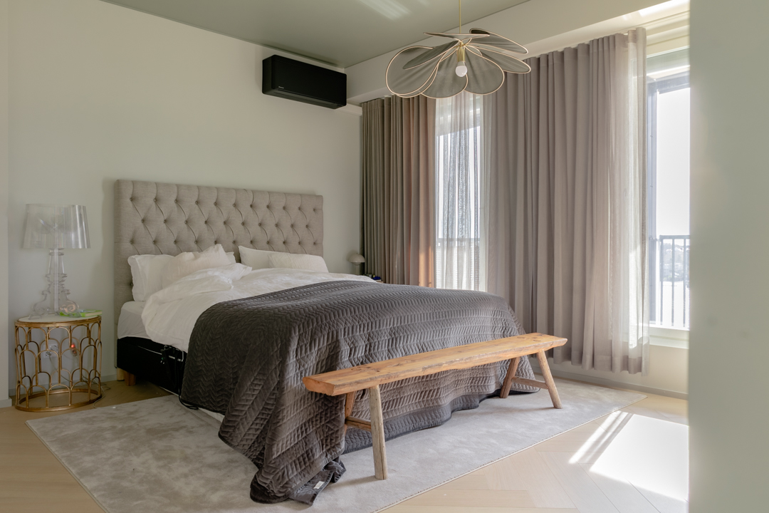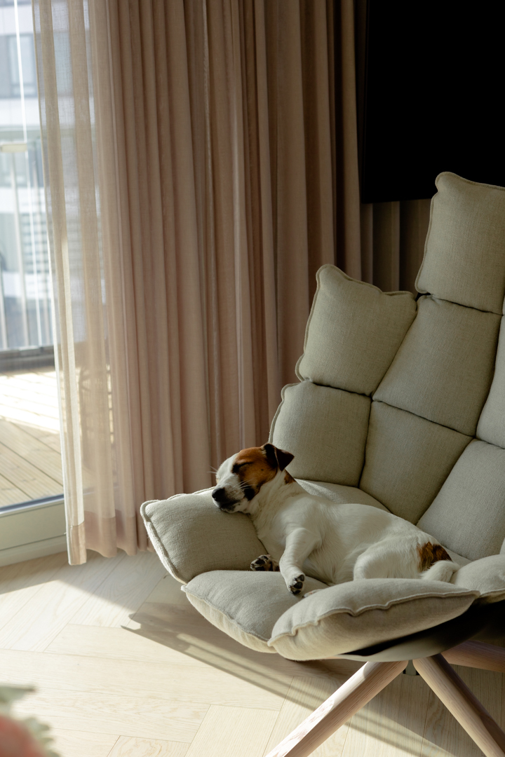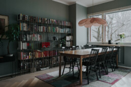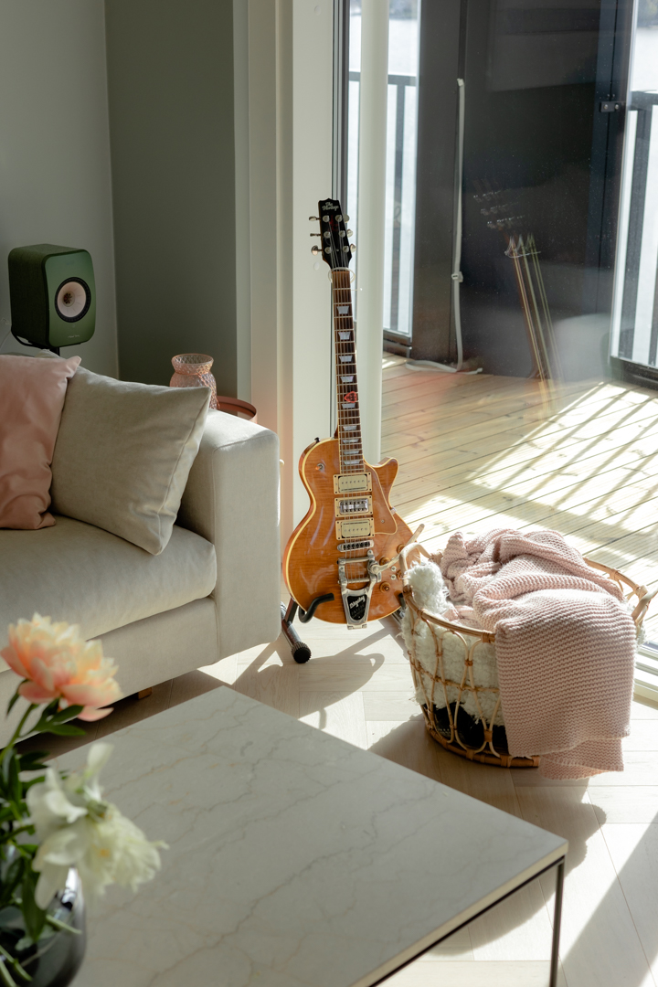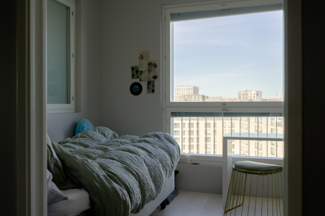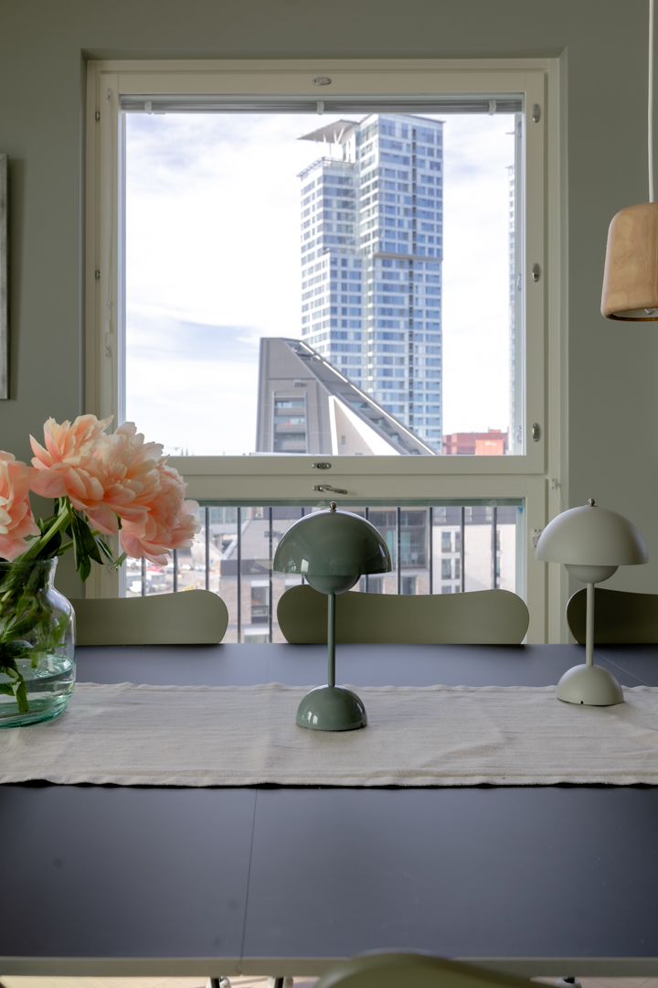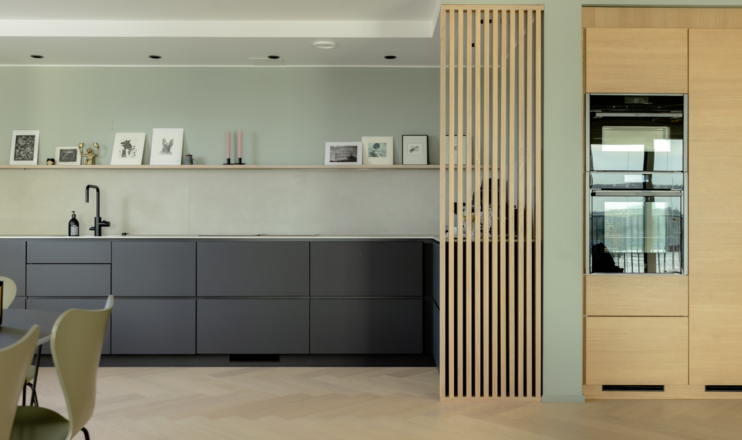 Maisemat vaihtuvat päätä kääntämällä tässä kodissa. Saaristotunnelmasta kaupunkisiluettiin, vain ikkunasta toiseen. Tämän asiakkaani kanssa ollaan matkattu parikin kotia, useampia eri huoneita ja kerroksia, ja välillä vähän mökkiäkin, vuosien varrella. Nyt uuden kodin toiveissa oli rauhallisuus, tunnelma ja lapsille oma maailma. Prosessi oli pitkä, rakennuksen edistymistä päästiin seuraamaan ensin virtuaalisti ja myöhemmin työmaakäynneillä. Useamman asunnon yhdistäminen toi sopivasti haasteita. Henkilökohtainen taide oli myös isossa roolissa tämän kodin suunnittelussa.