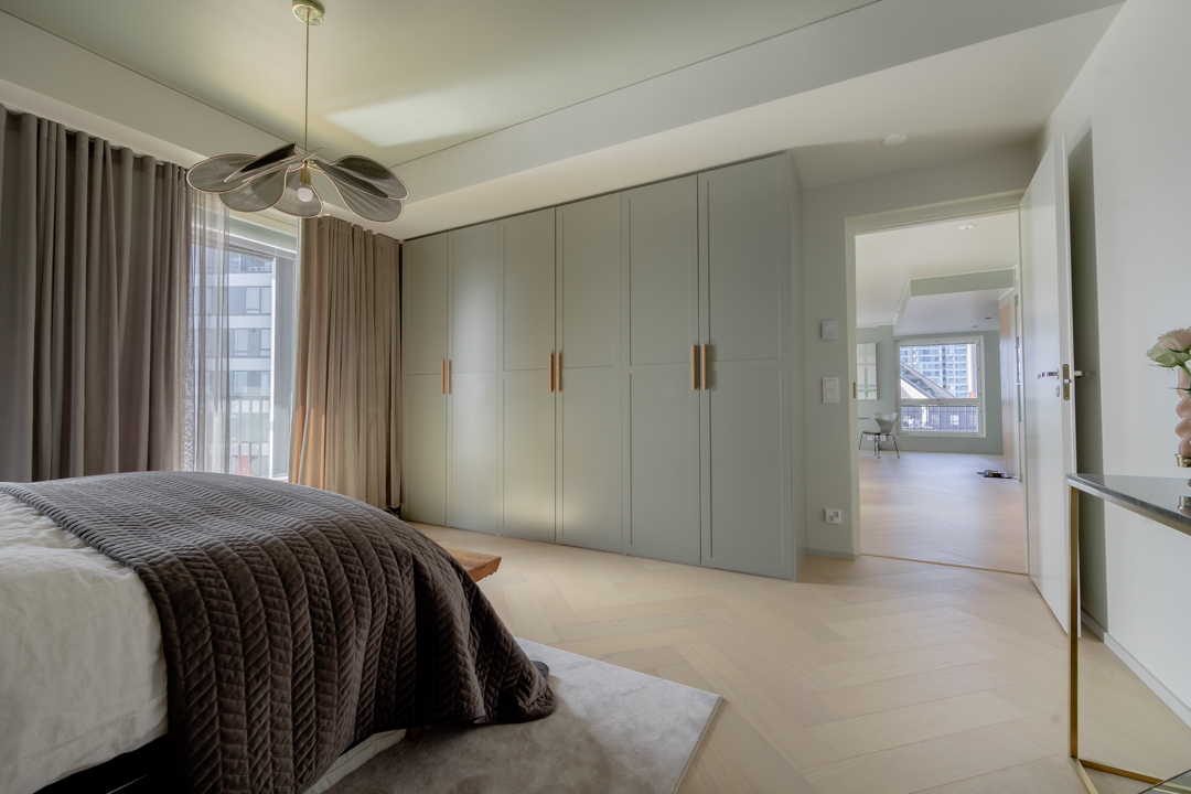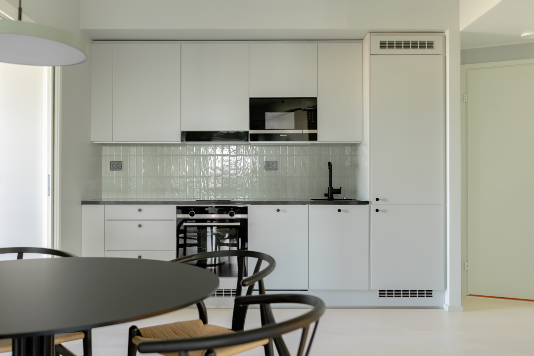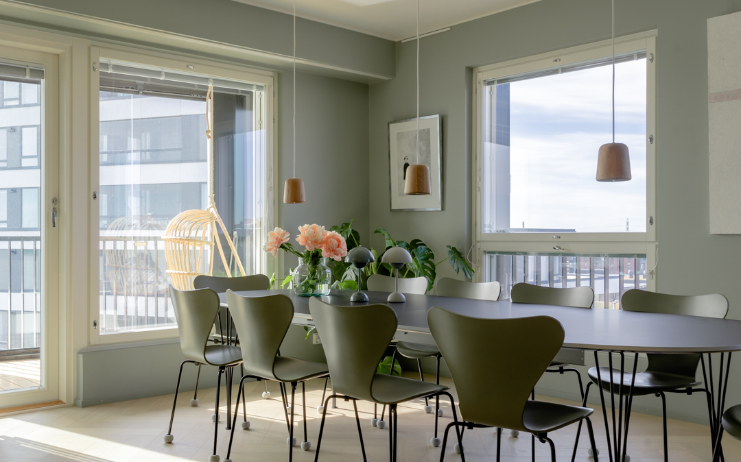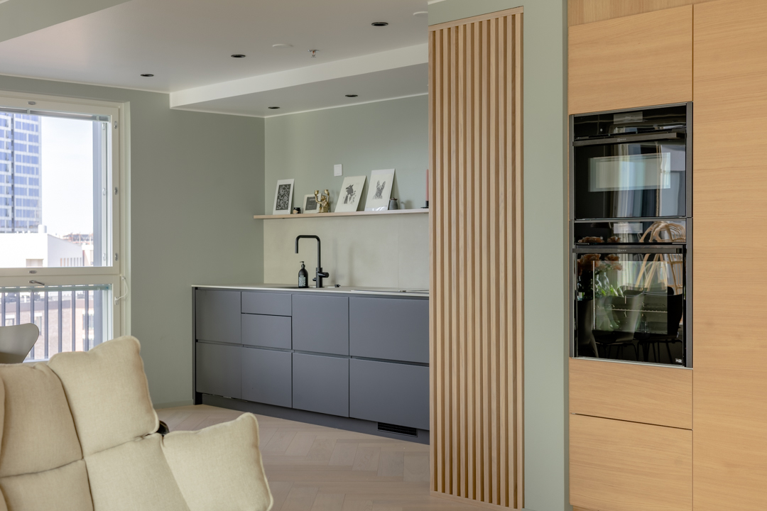 Viimeisin yhteinen projektimme oli uudiskohteen suunnittelu, jossa useampi huoneisto yhdistettiin toimivaksi kokonaisuudeksi. Projekti oli pitkä ja vaativa. Projekti käsitti kiinteiden kalusteiden ja materiaalien valinnan, väri- ja valosuunnittelun sekä huonekalujen valinnan. Kaikki tämä toteutettiin tuttuun tapaan avaimet käteen -periaatteella.